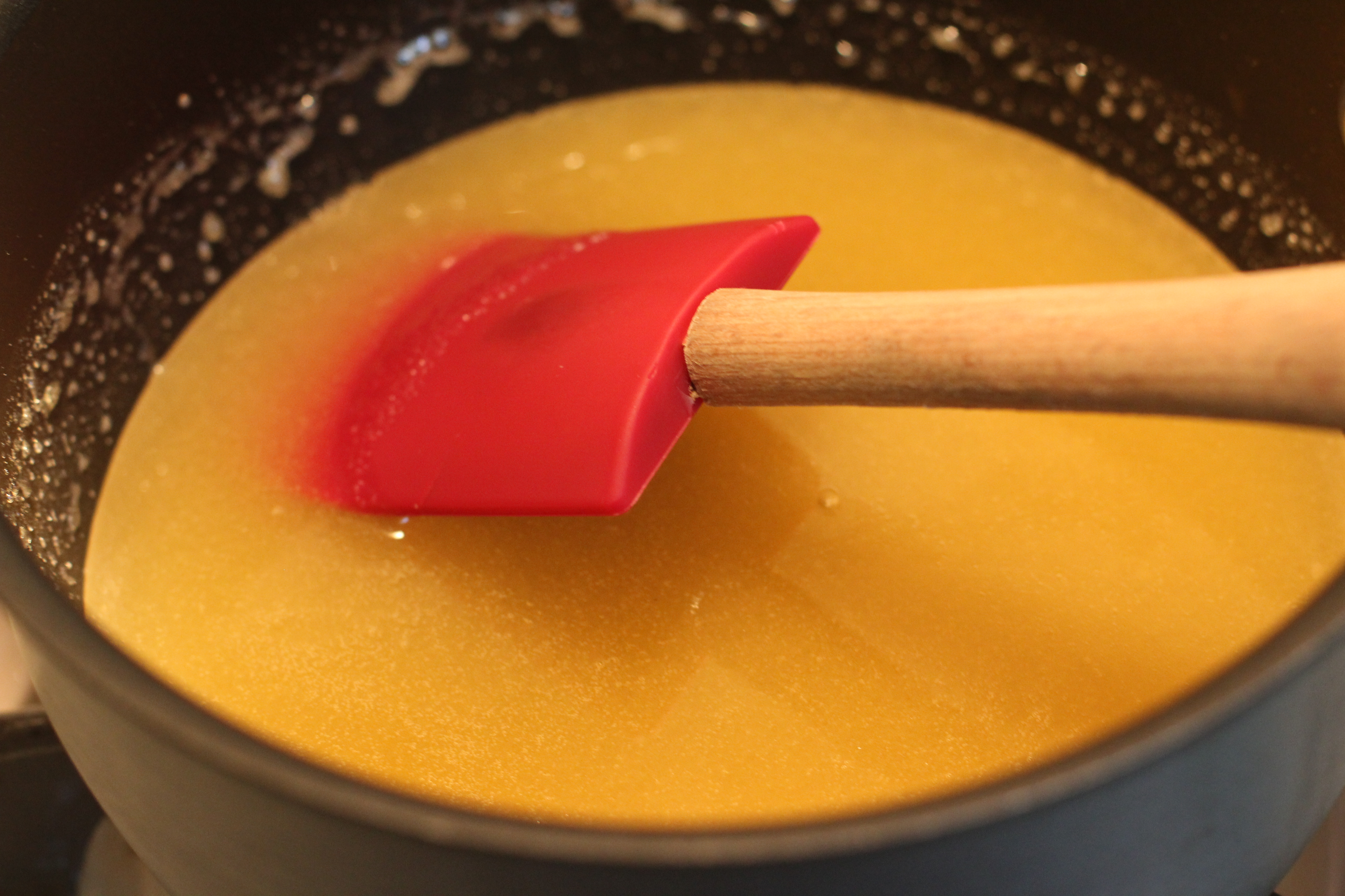 Pour the 375g of sugar and 1/2 of the puree/water mix into a saucepan. Place on a low heat and wait for the sugar to dissolve.