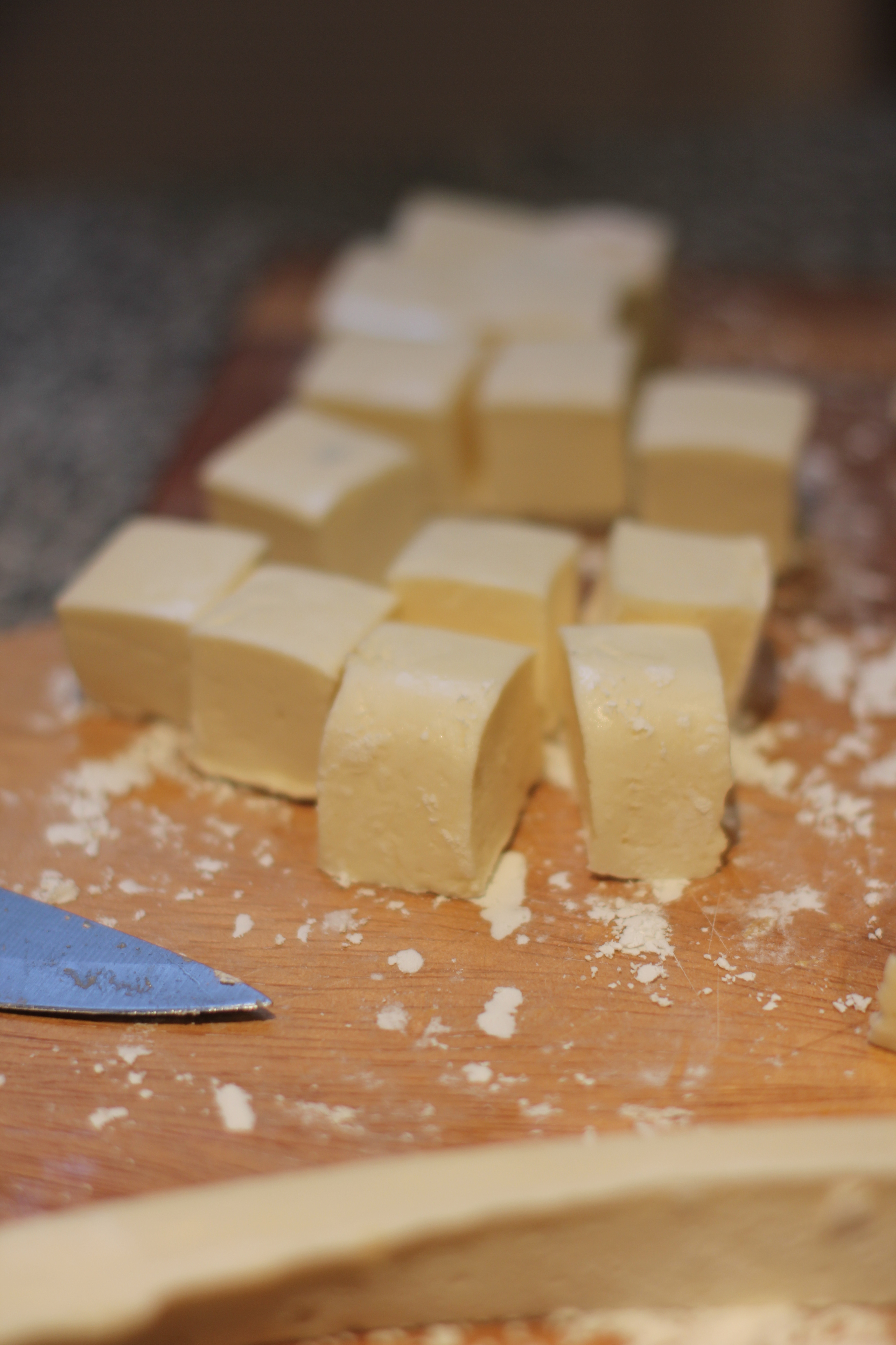 Once the mixture has set you should be able to pull the mixture out and cut it into whatever shape you like. I place it a on board covered with icing sugar and cut with a sharp knife.