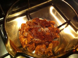 When it is brown and crispy you pick it up and place it into the hot treacle mixture. The best tool for doing this is a skewer or chopstick. You can thread the unduwel on with out damaging them and they’re perfect for holding over a pan to let the excess syrup drip off.