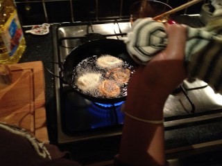 After six hours, heat a frying pan with about 2 inches of oil. In a separate pan warm a cup of kithul treacle, the sugar and salt. You can replace the brown sugar with palm sugar if you have it. Once the sugars have melted turn the heat off. For the purposes of absorption this mixture must be hot but never boiling. I watch the syrup and gently turn the heat on when it’s getting too thick. If it’s too thick the unduwel won’t absorb the sweet syrup.