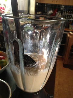 When blended add the 1 cup of fine rice flour, mix and leave in a warm spot to rise for at least 6 hours.You want this mixture to have the consistency of a thick cake or muffin batter. It should hold it’s shape when you spoon it. If it’s coolish, winter weather I will put the oven on a warm setting, cover the dough with a damp cloth and place in there for a short while.