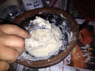 In the morning place the drained dhal into a blender or food processor and add just enough water to make it into a smooth paste. We made sure to add the water a little at a time, the object being to make the mixture as thick as possible.