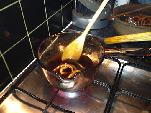 When it is brown and crispy you pick it up and place it into the hot treacle mixture. The best tool for doing this is a skewer or chopstick. You can thread the unduwel on with out damaging them and they’re perfect for holding over a pan to let the excess syrup drip off.