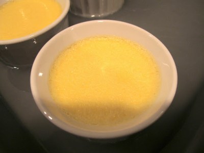 Divide the mixture between the ramekins through a strainer (remember all those lovely spices you don’t want in your crème brulees. Pour cold water into the baking tin until it comes two-thirds of the way up the ramekins.