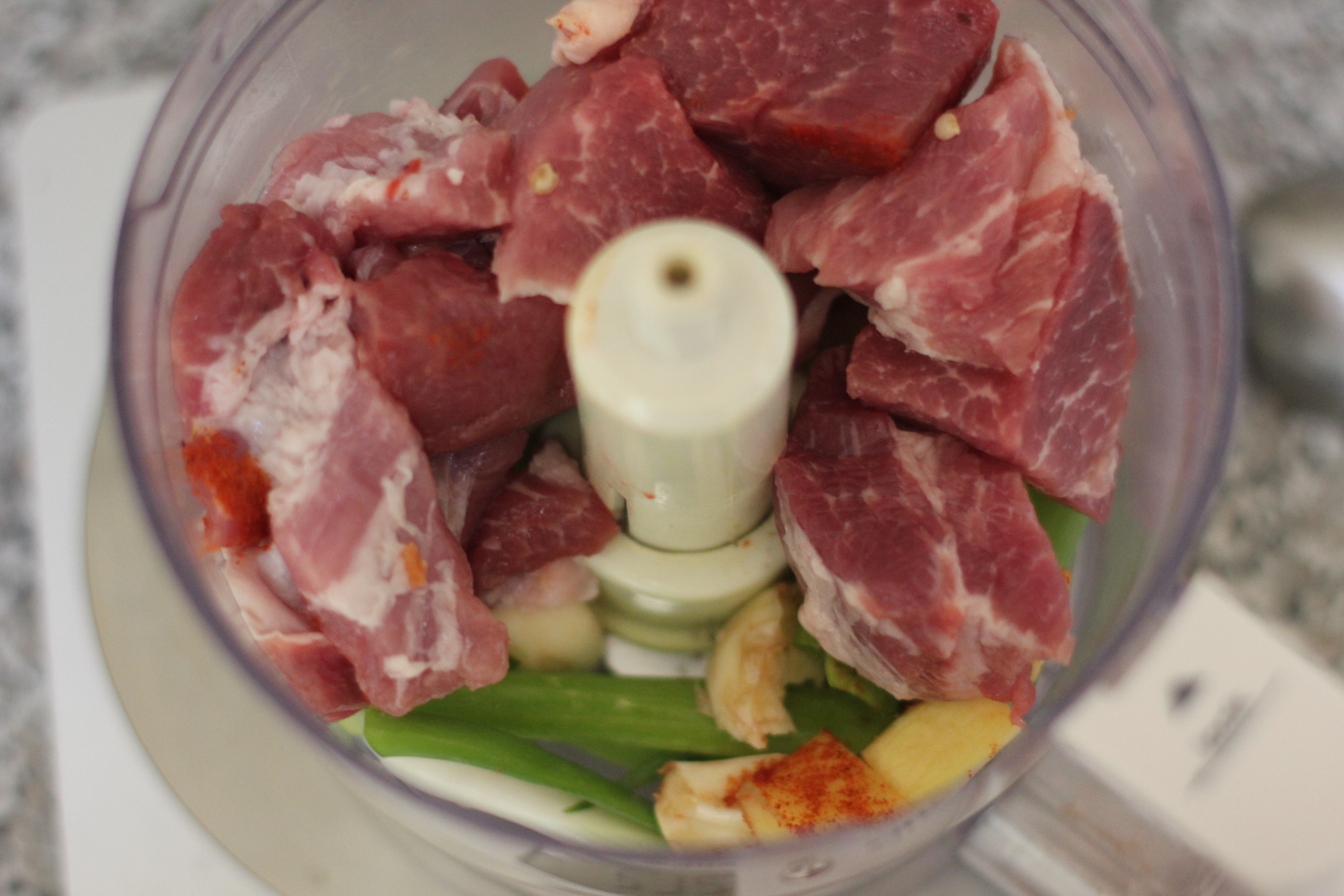 Place the pork, spring onions, garlic, ginger and spices in the bowl of a food processors and blitz. Your want a uniform paste, like so