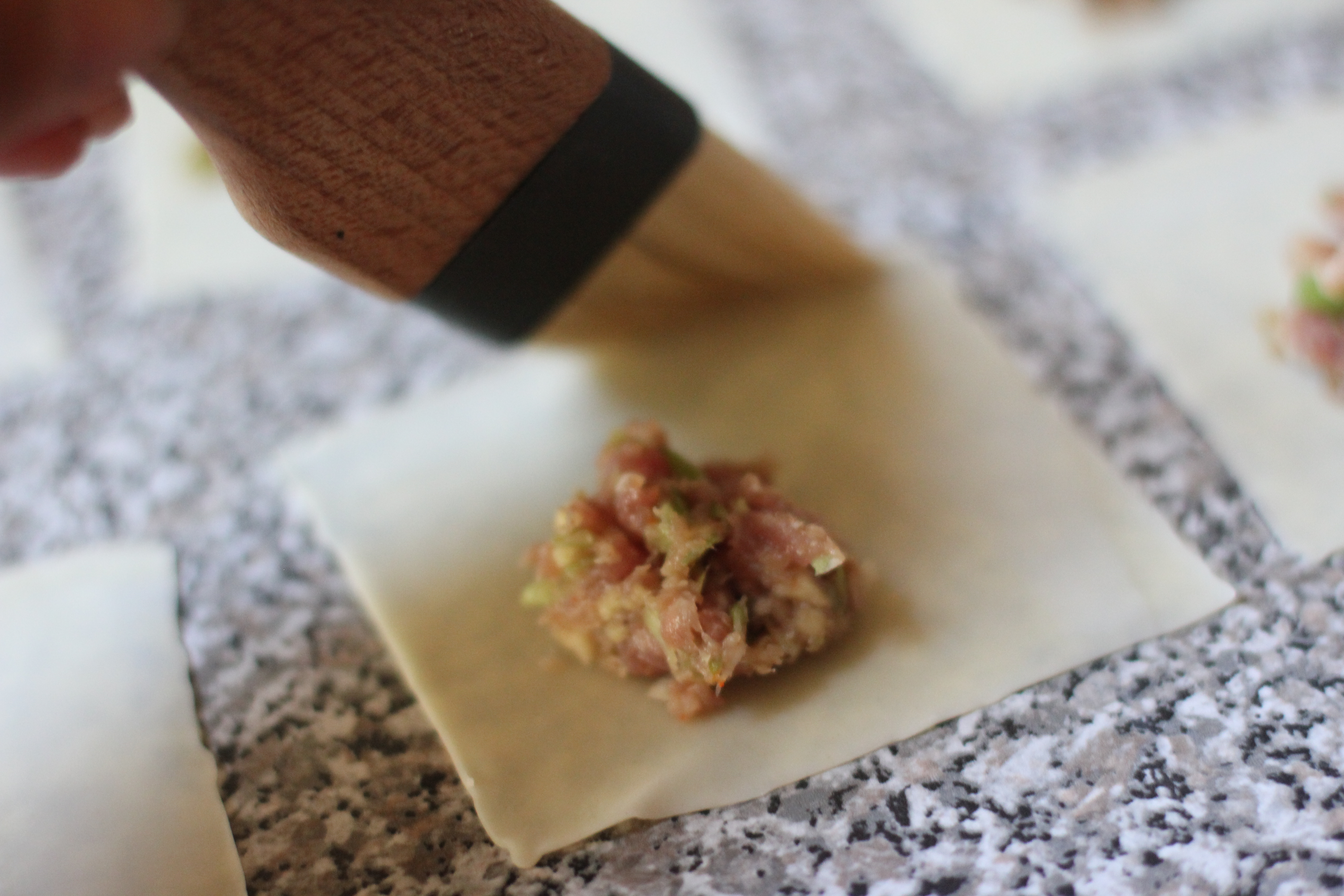 Basically, you place a teaspoon full of the pork mixture onto the wonton wrapper. I painted the outside with water and folded the wrapper into a triangle, squeezing out any extra air.