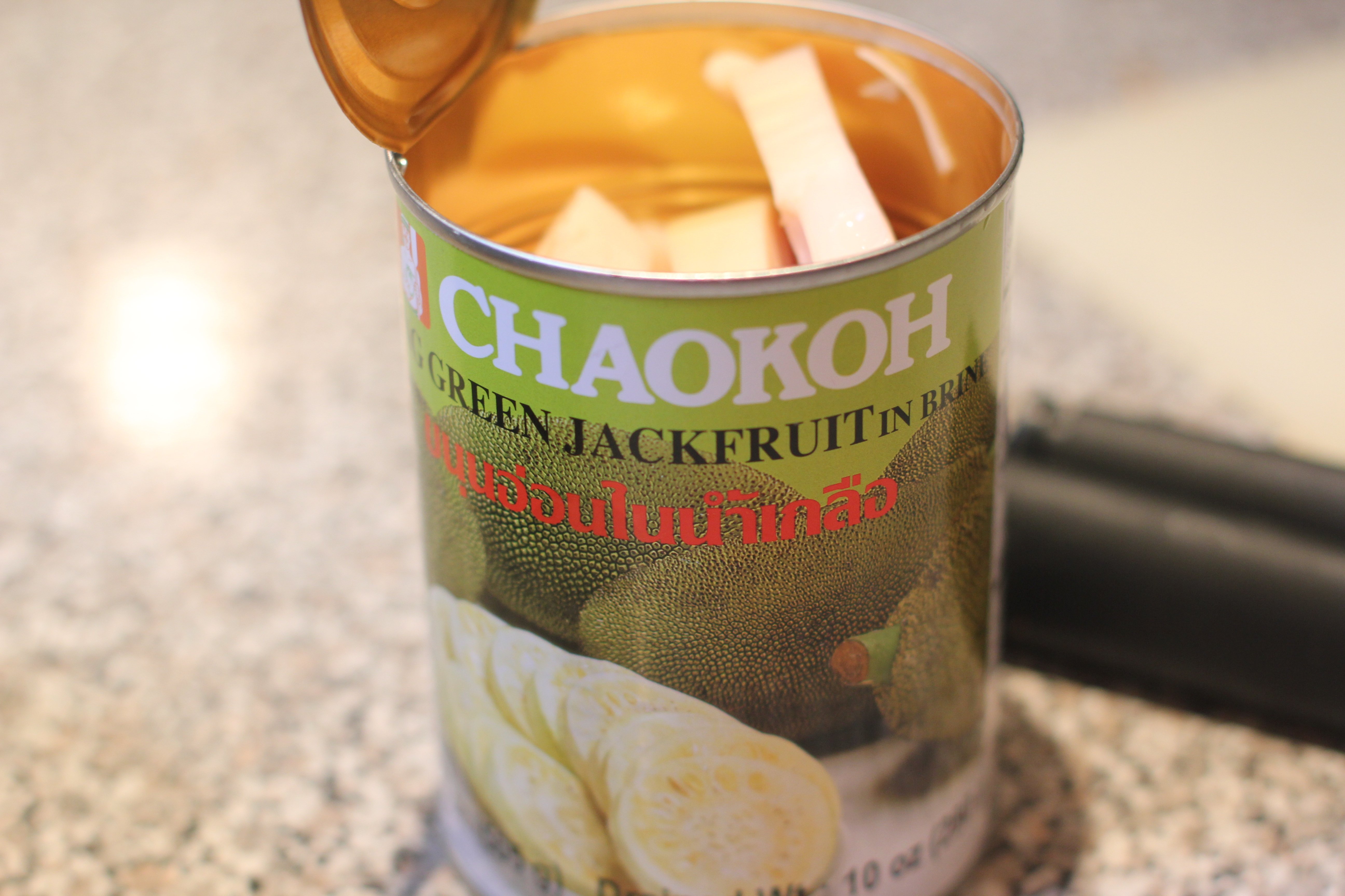 Drain the tin of jackfruit and cut the pieces into uniform sizes. You want them all to cook at the same time.