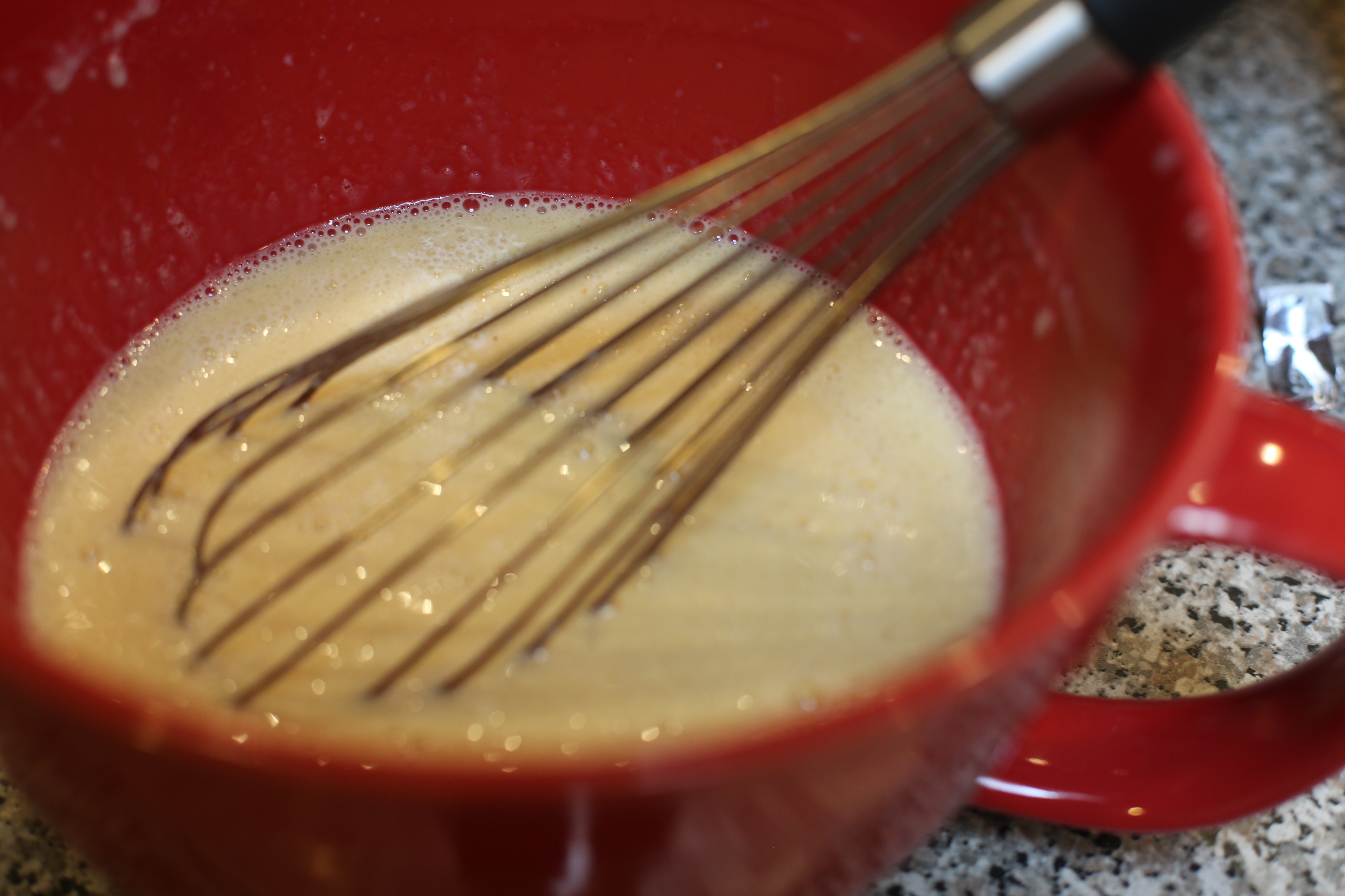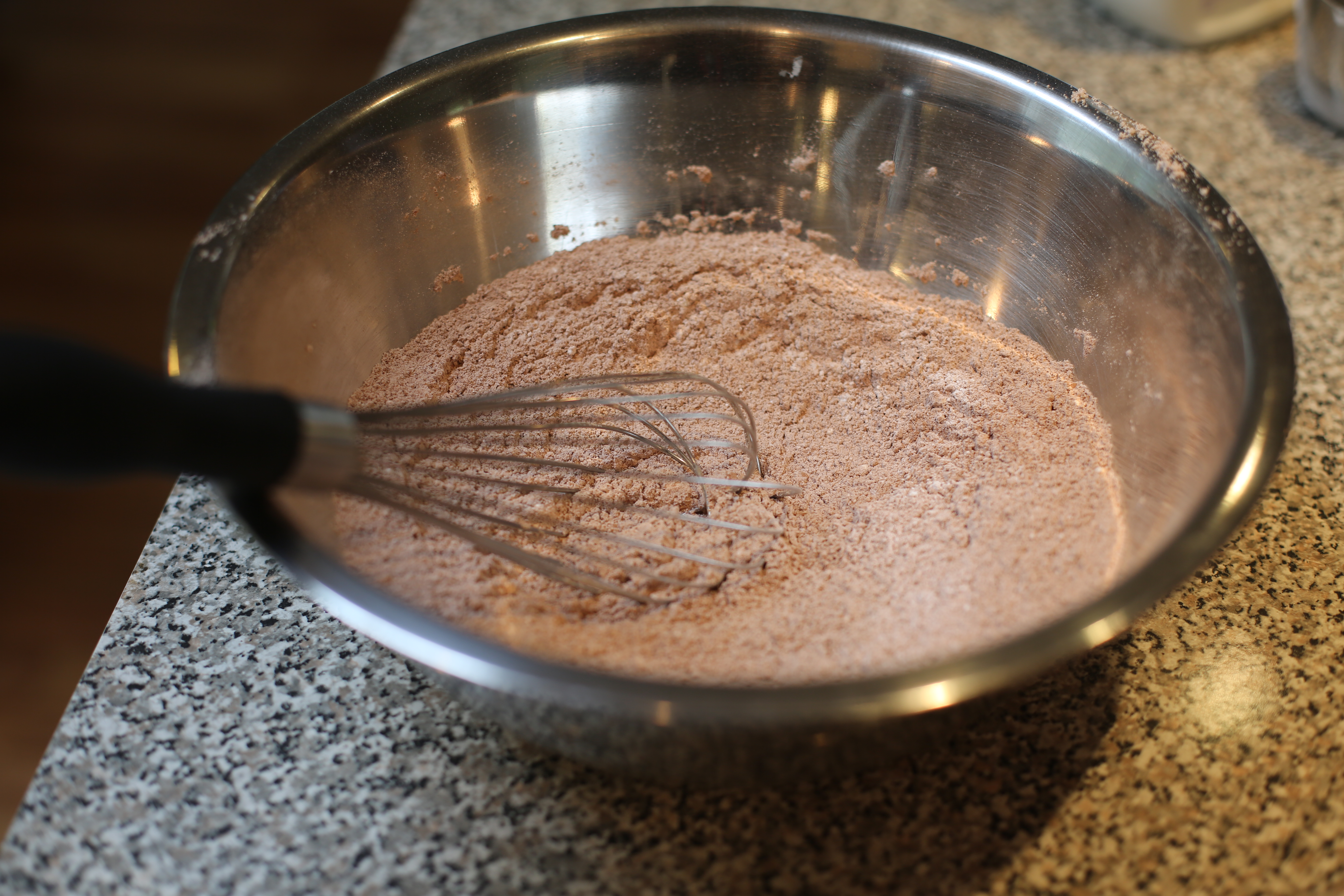 In a second, smaller bowl mix all the wet ingredients and whisk together until the eggs are broken up.