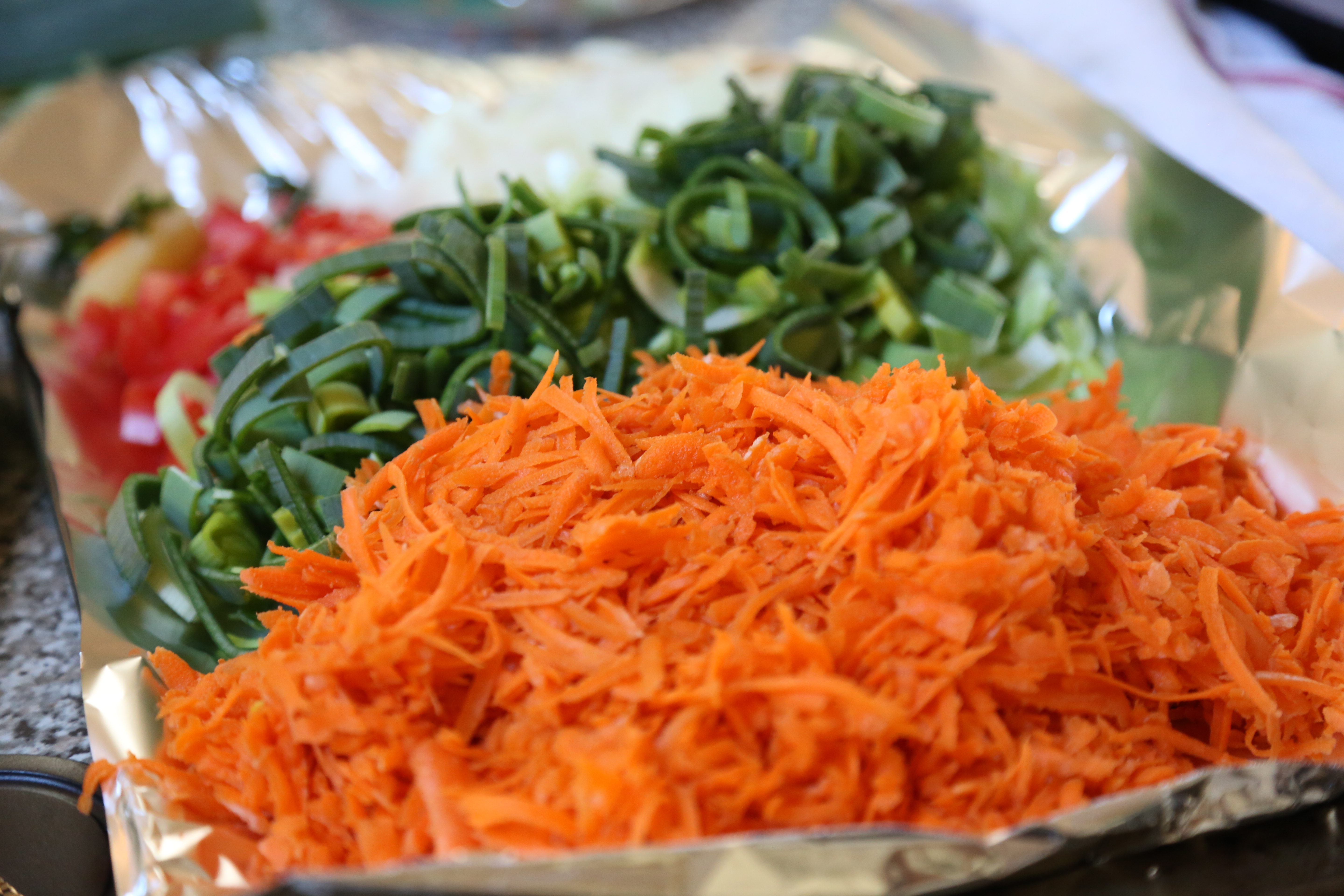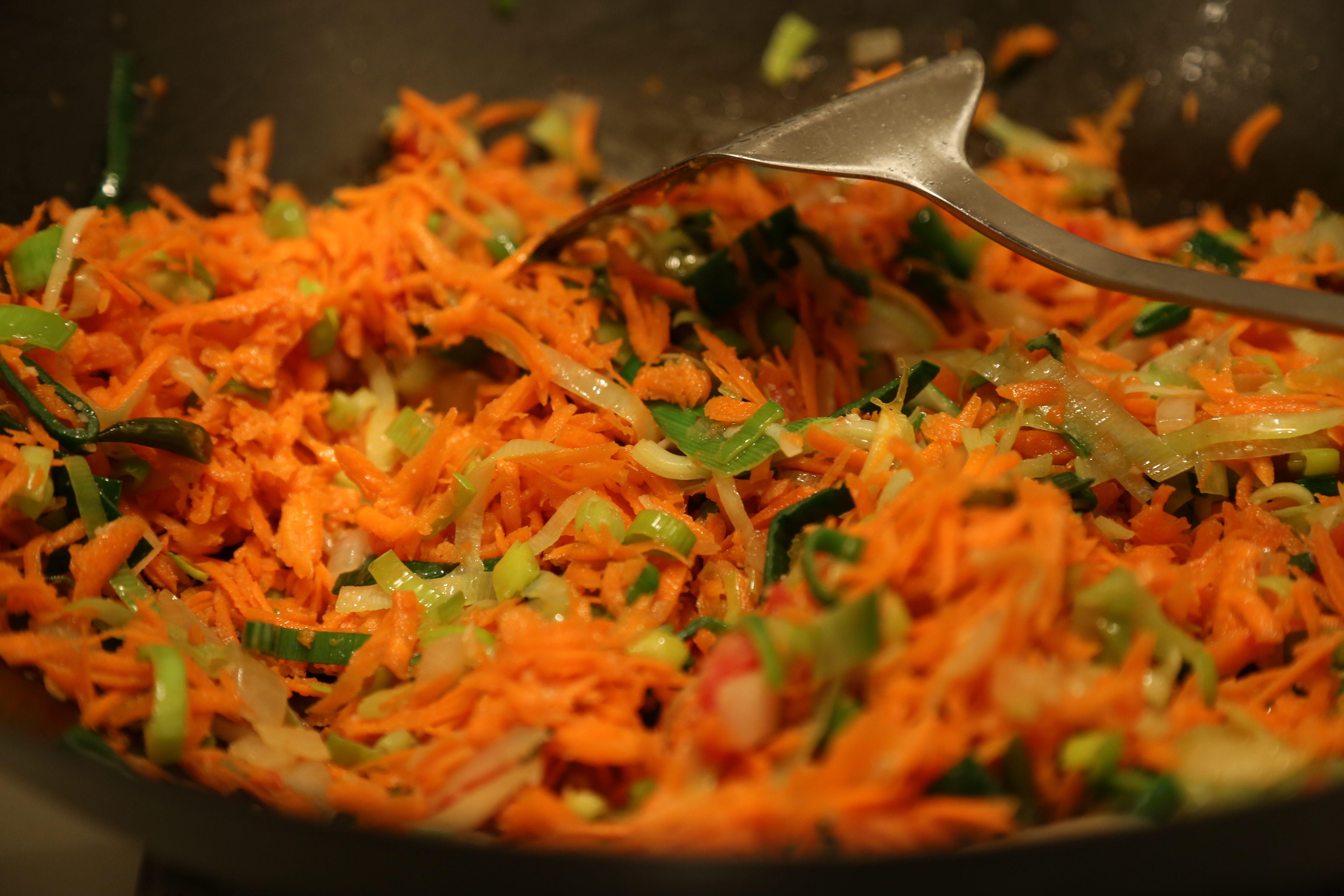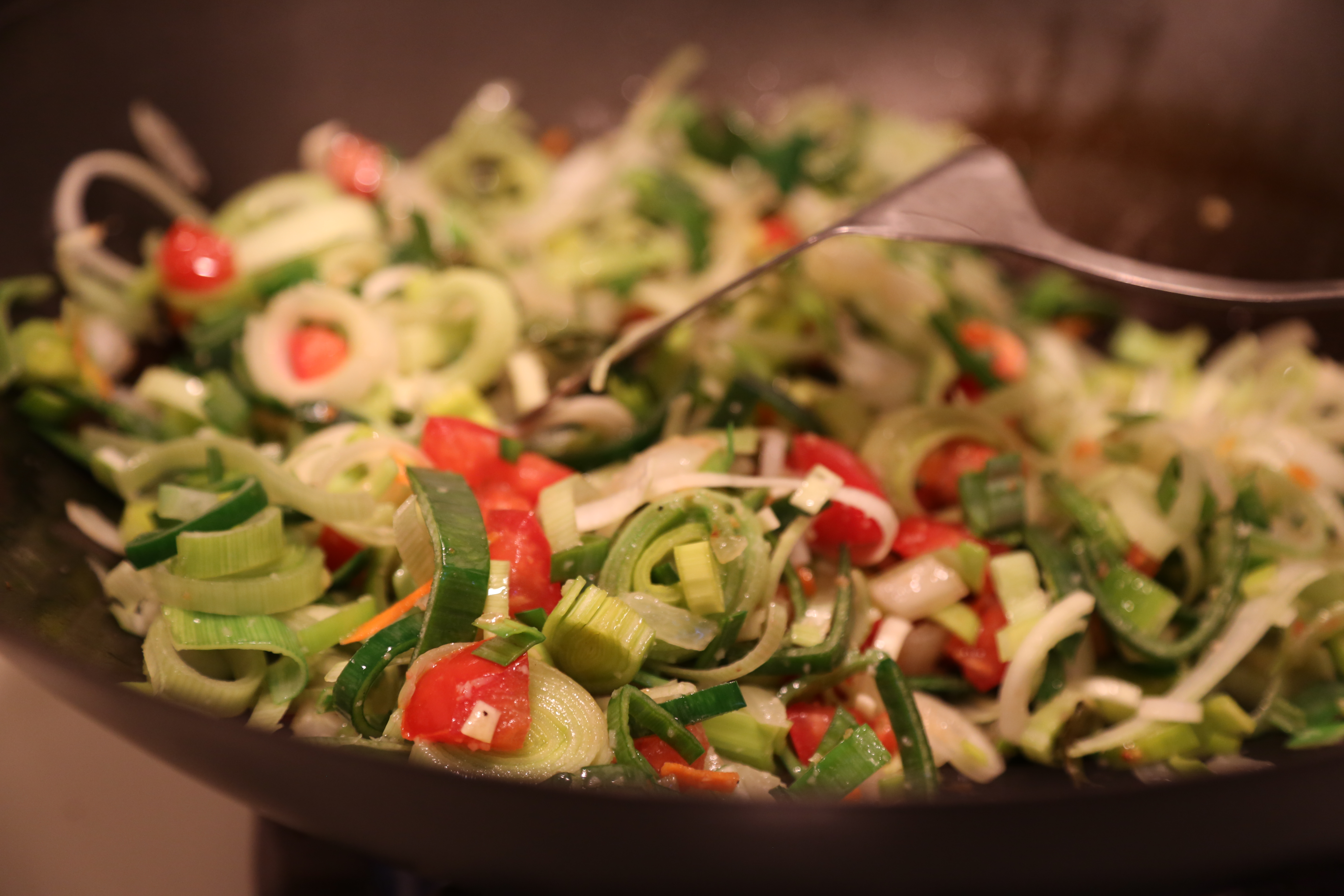 In a large wok or frying pan add 3-4 tablespoons of oil and the onions, garlic, chilli and curry leaves. Fry for a few minutes until the onions are browned and then add the leaks. I like to cook the leeks a little bit longer as raw leeks can be a bit like raw onion. Add the tomato and carrot and fry until just soft. Add a couple of tablespoons of soy sauce and extra chilli flakes if you want more spice.