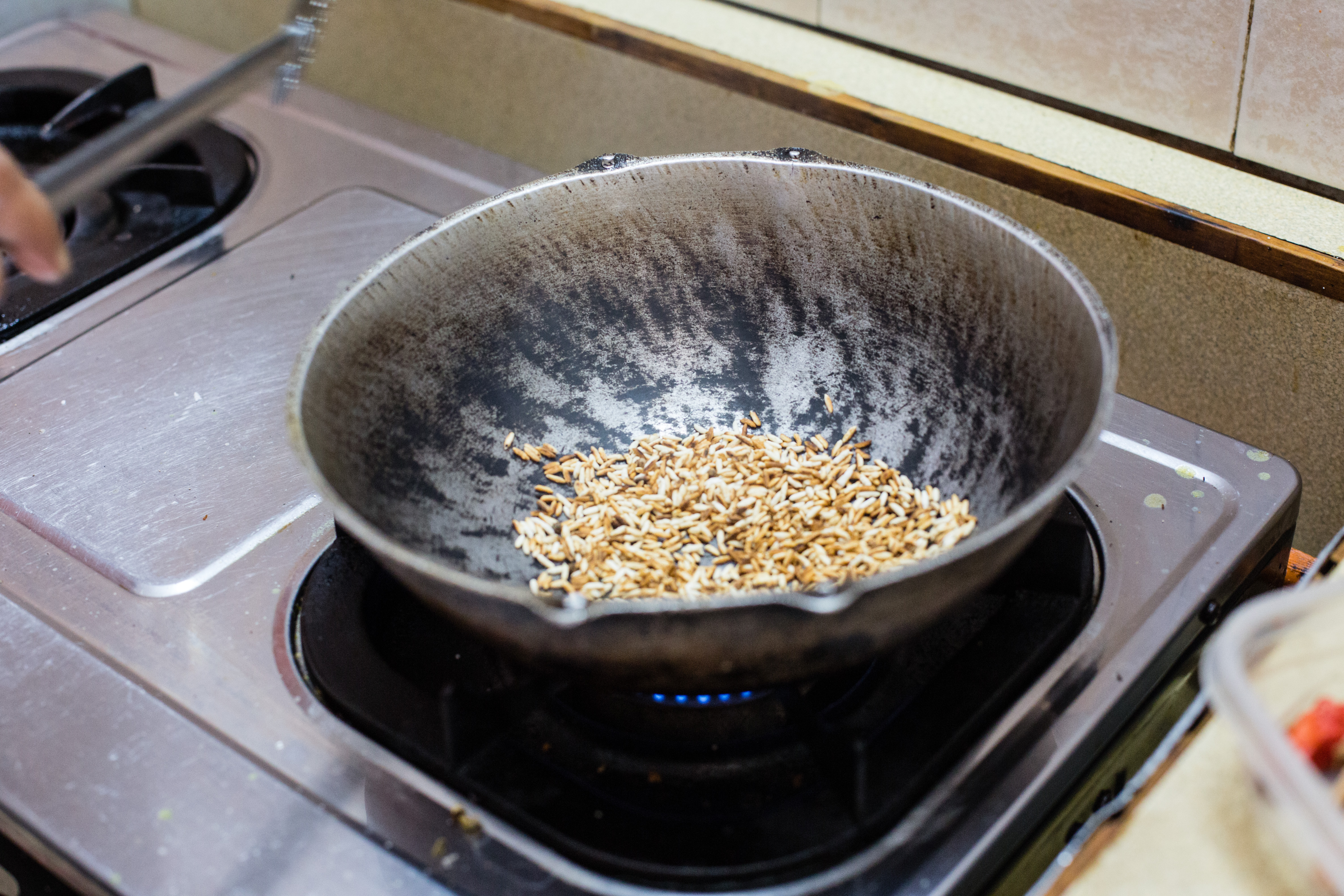 While the pork is cooking  make the curry powder. In a dry pan roast the rice until brown, when you’re satisfied with the colour add the curry leaves, pandan leaf and cinnamon.