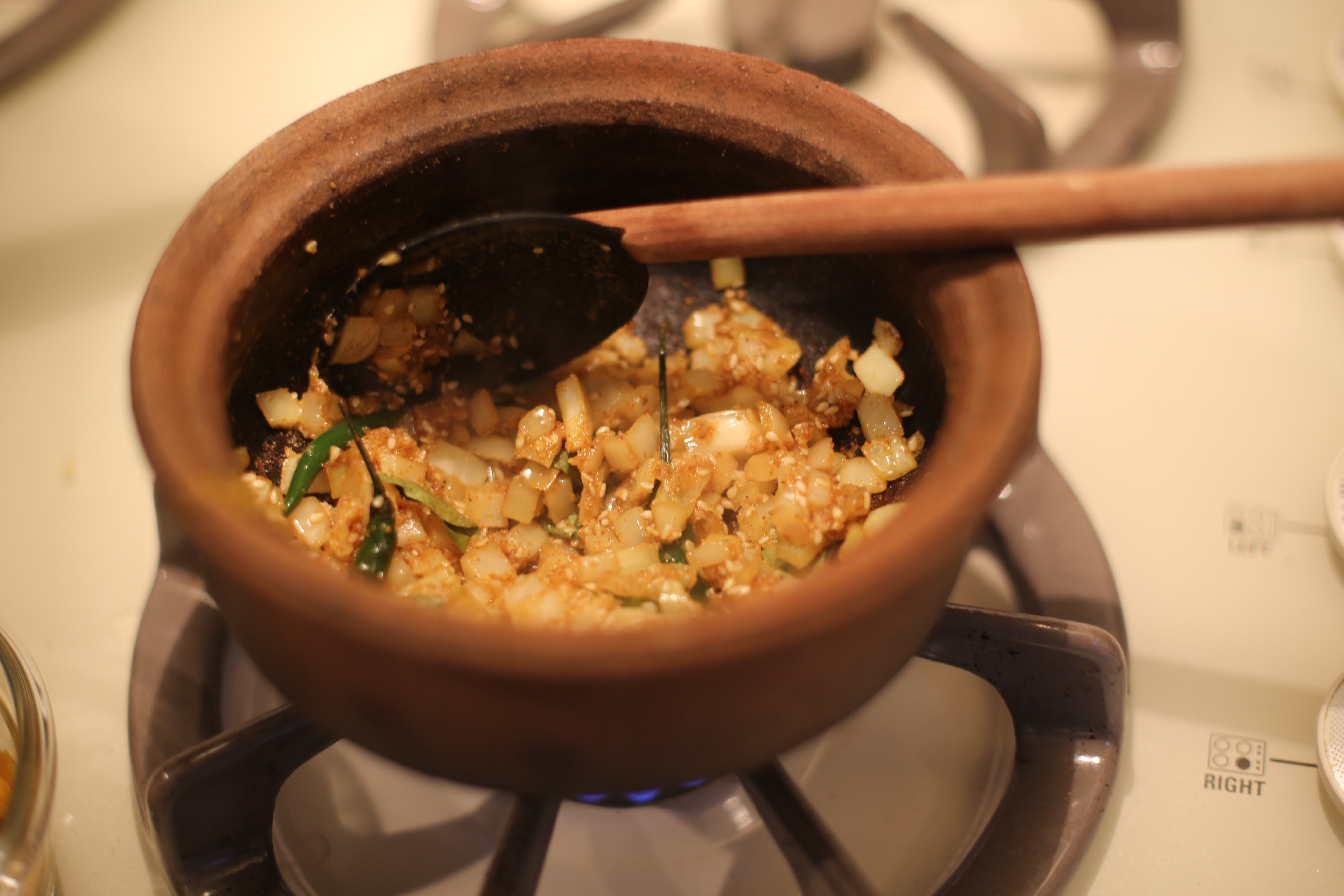 Drain the cashews and place the pan back on the heat. Add a splash of oil, the chilli powder, curry powder, cinnamon and sesame seeds. Fry for a few seconds until the sesame seeds are toasted.