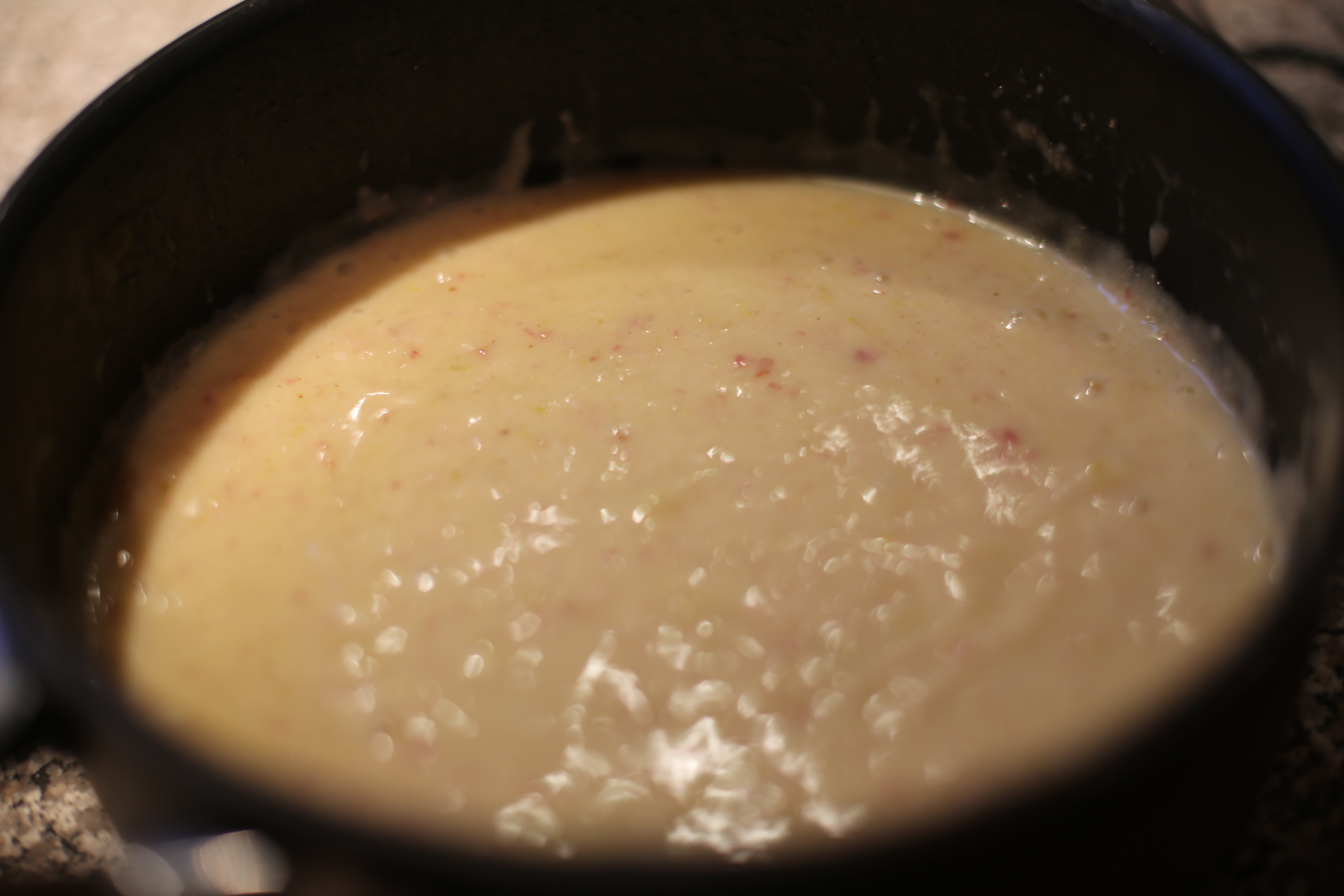 When the soup has cooked puree using a stick blender or place the whole mixture in a blender, which will do the job as well. Add extra water at this point if needed.