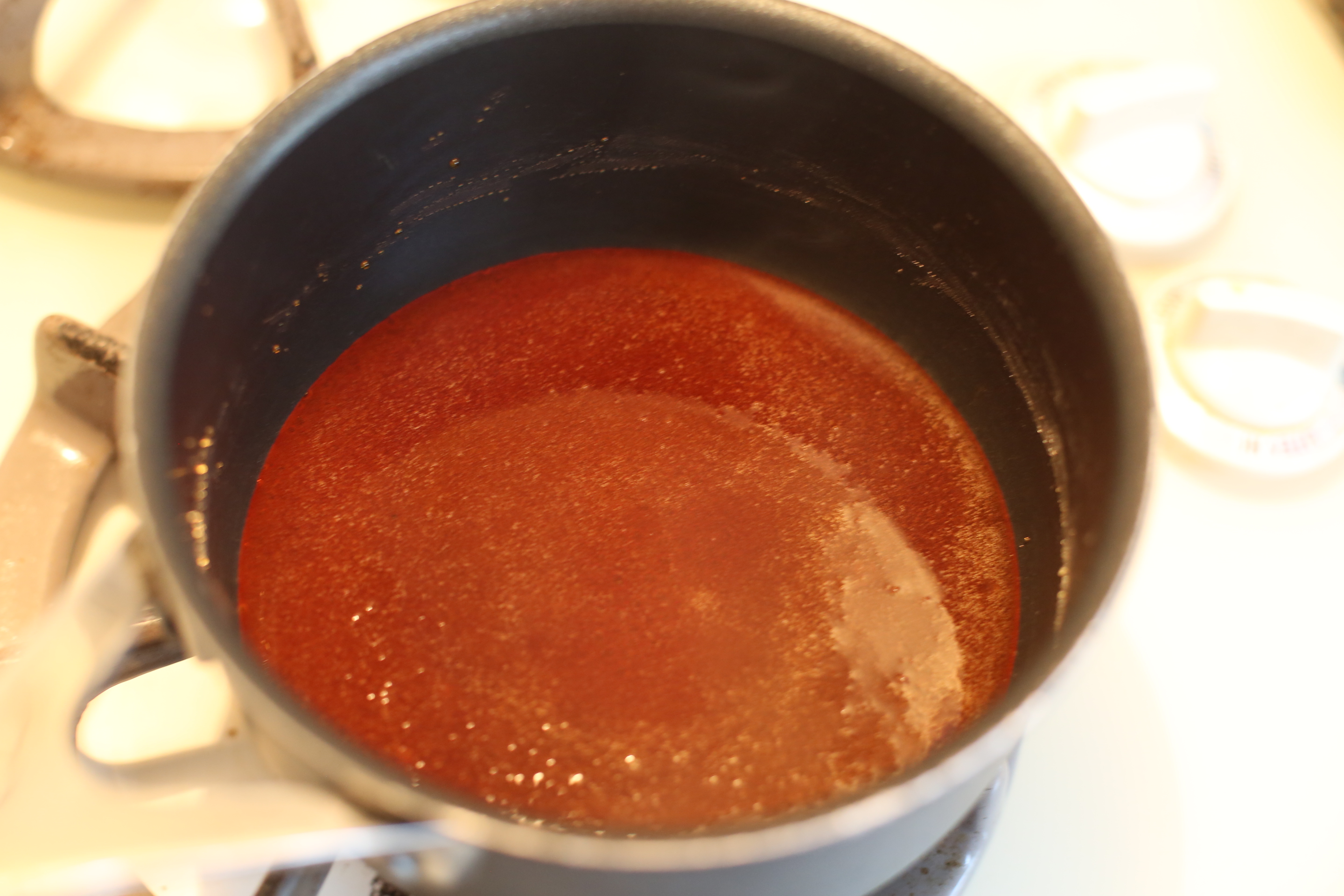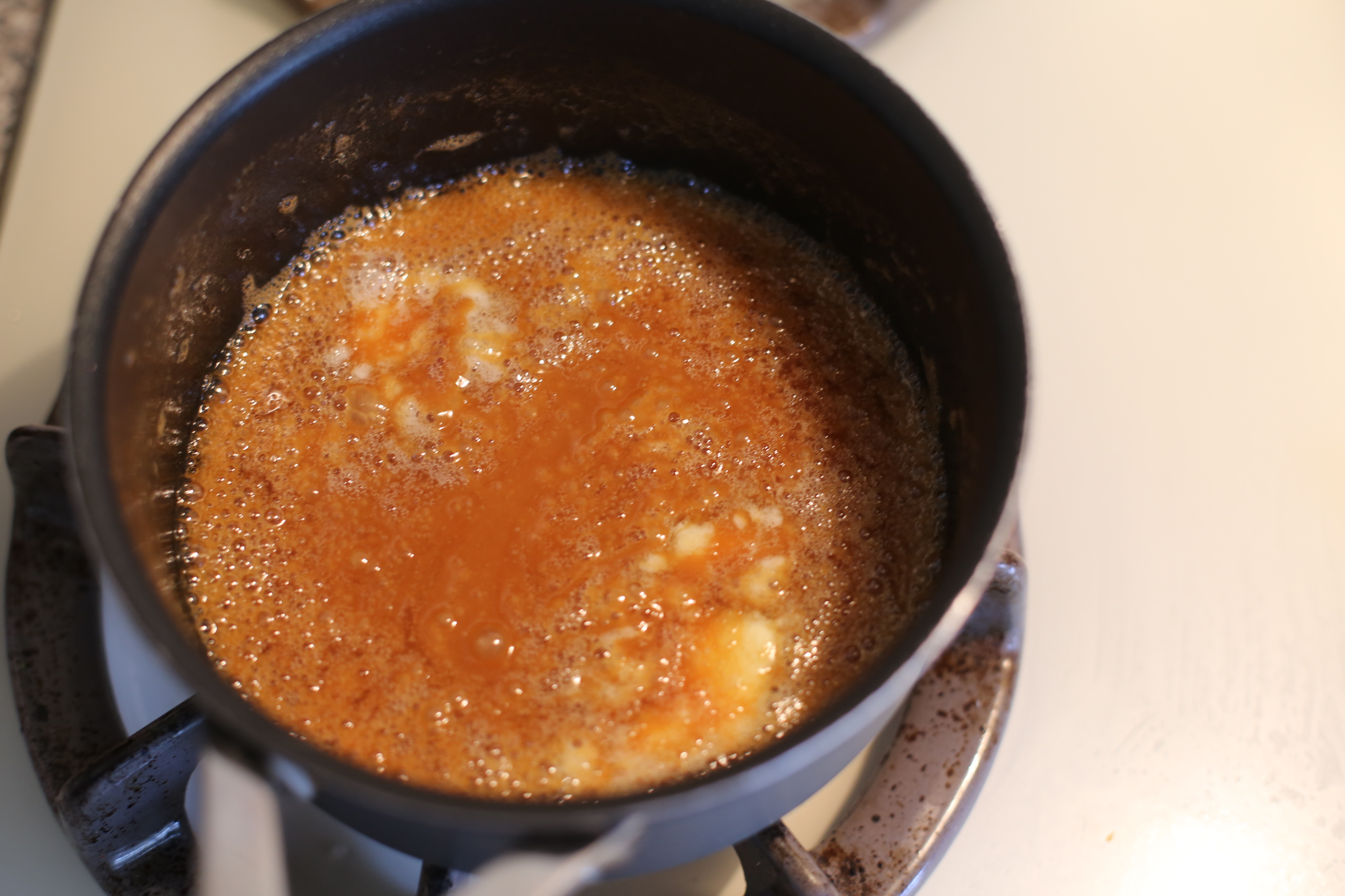 Once all the sugar has melted, you’ll see the sugar syrup becoming a dark brown/amber colour.