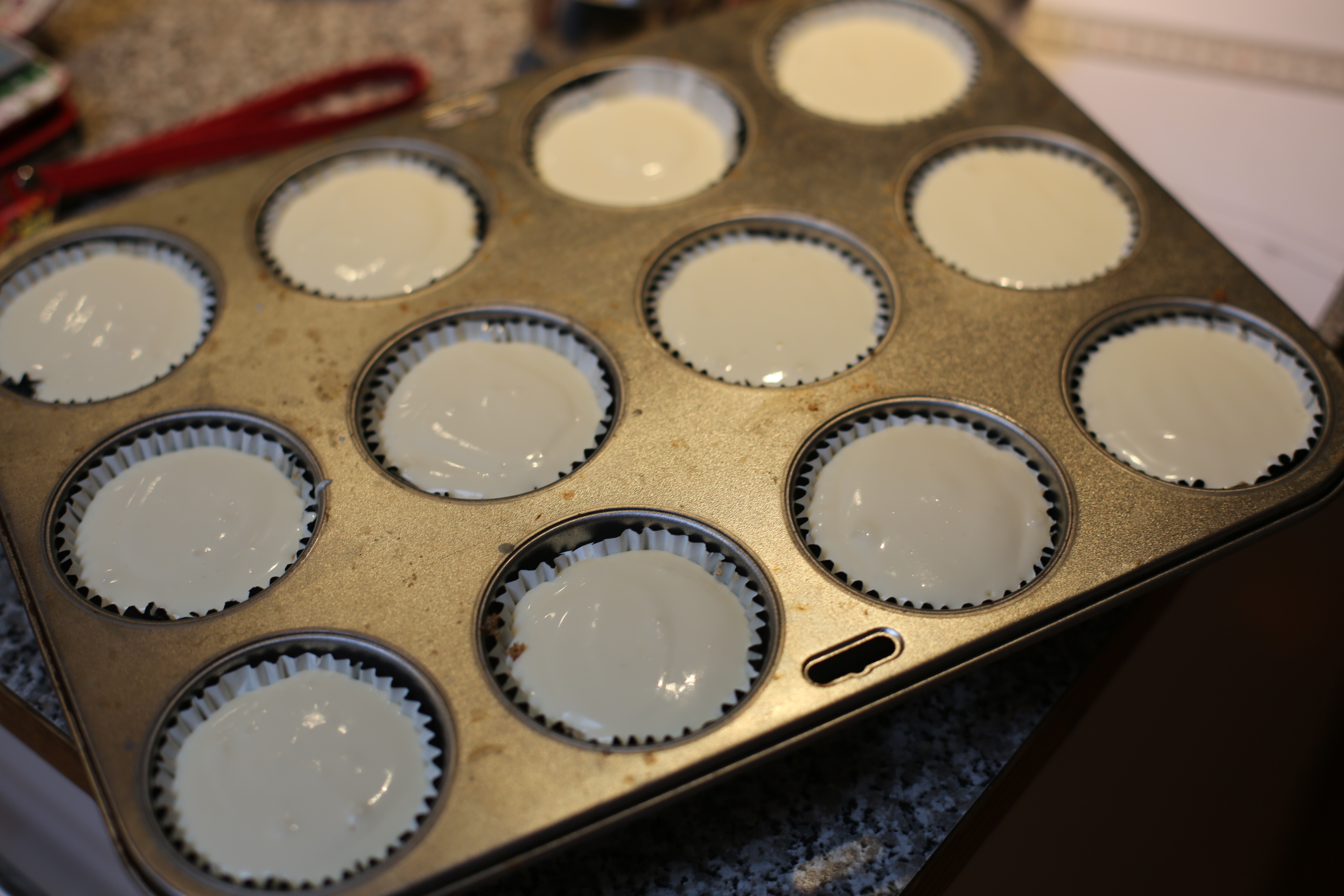 Bake cheesecakes for 20 minutes. Remove from the oven and allow to cool in pan for 30 minutes.