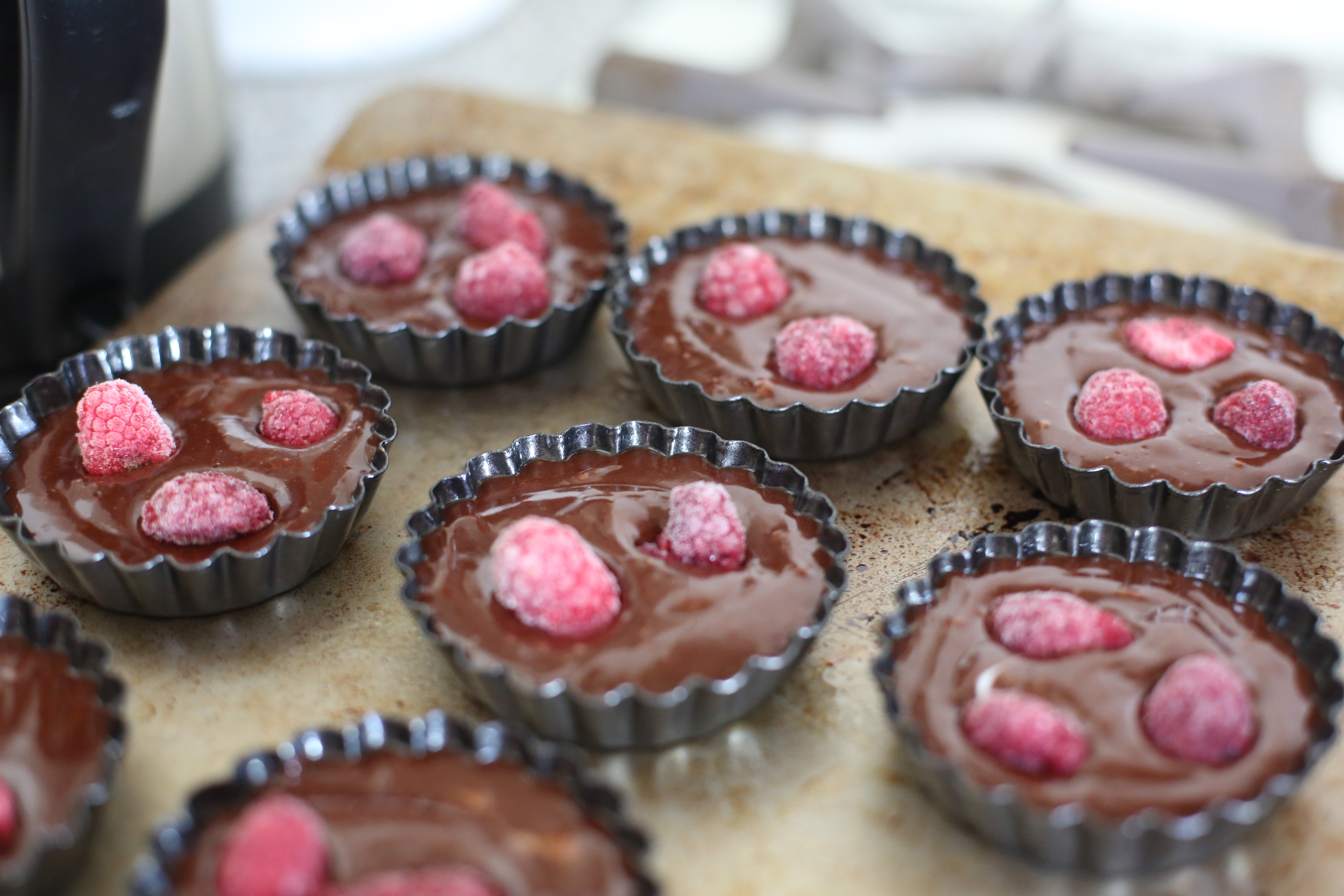 Whisk in the chocolate mixture until combined. Pour into lightly greased tins lined and top with the raspberries.