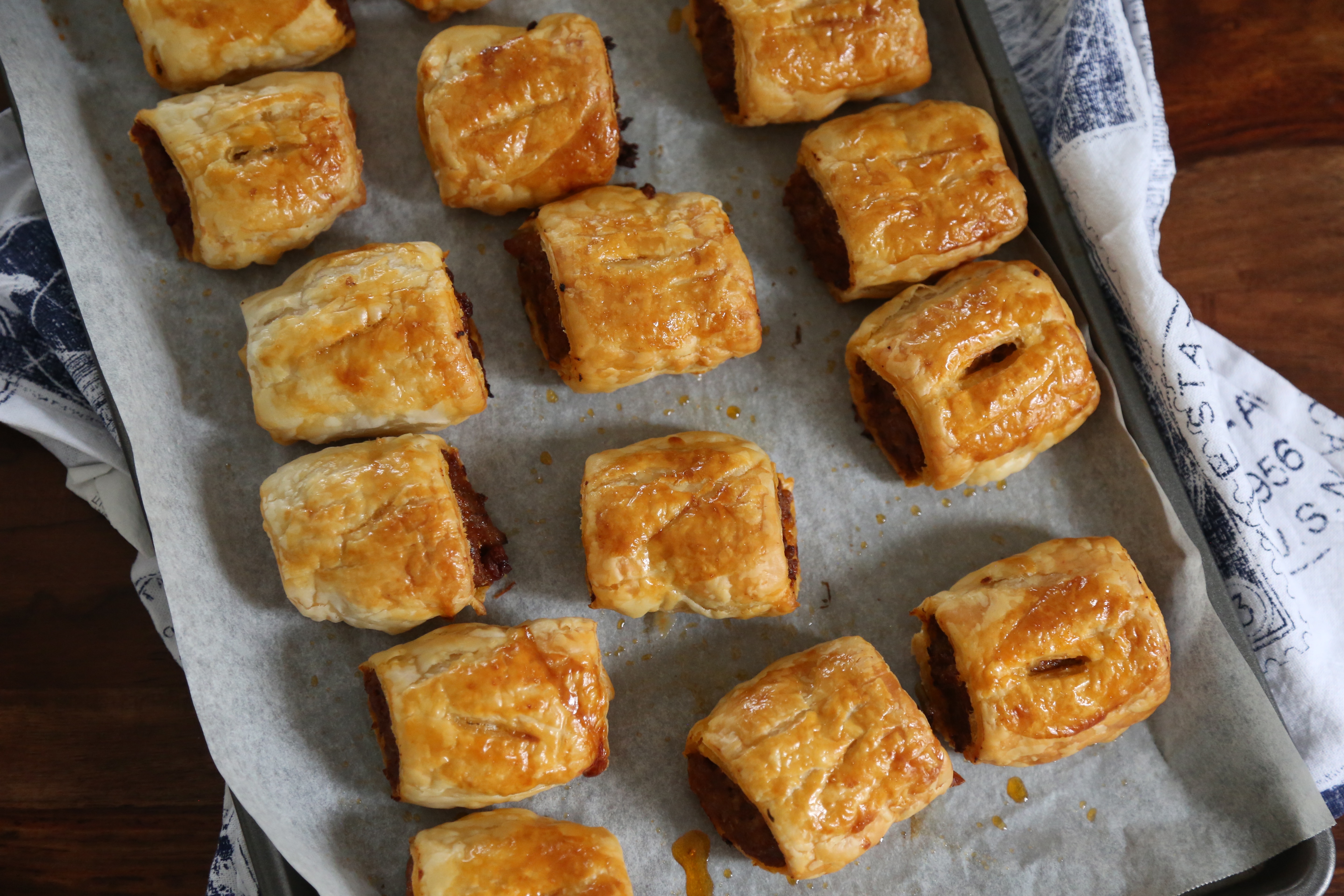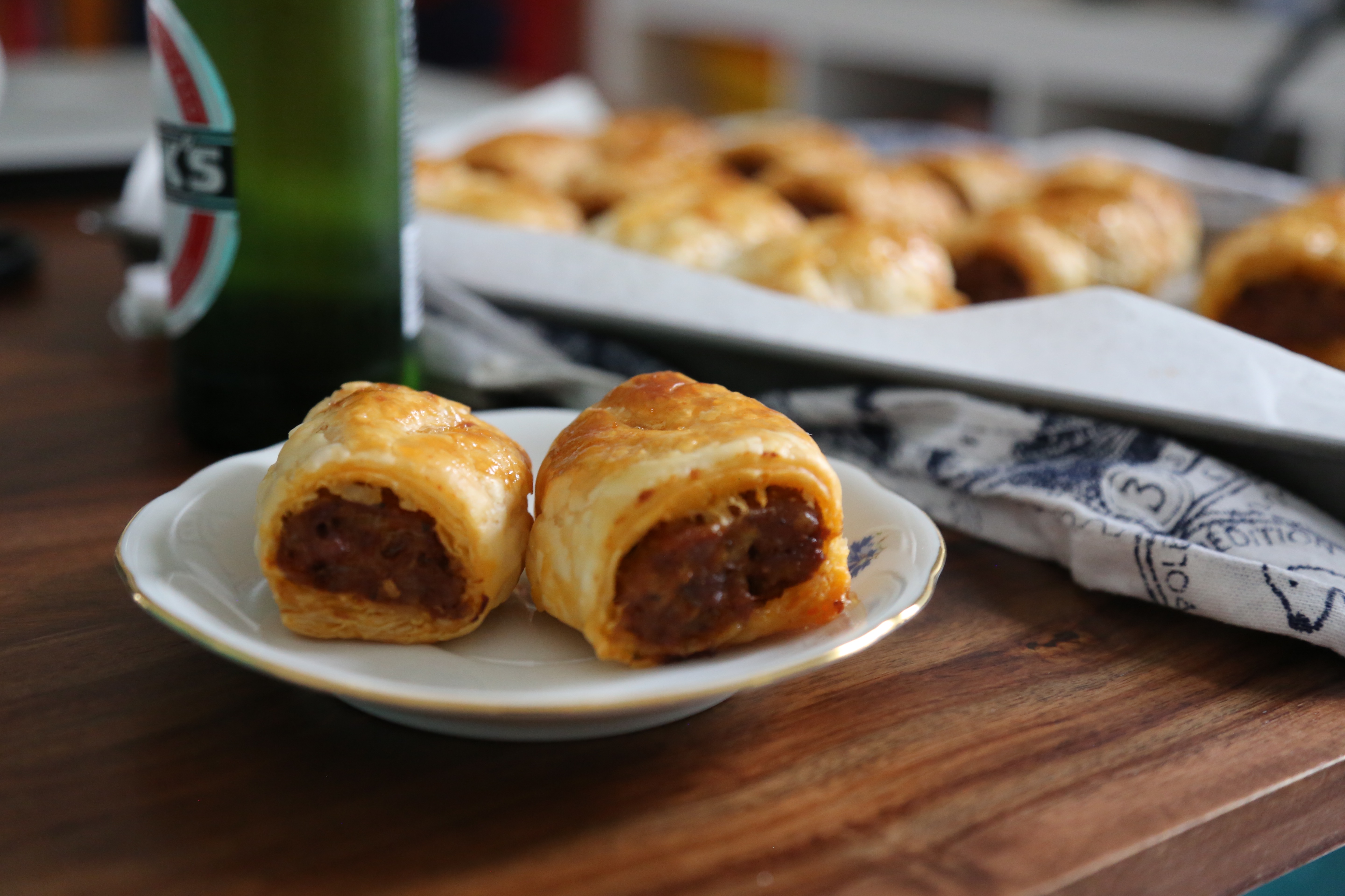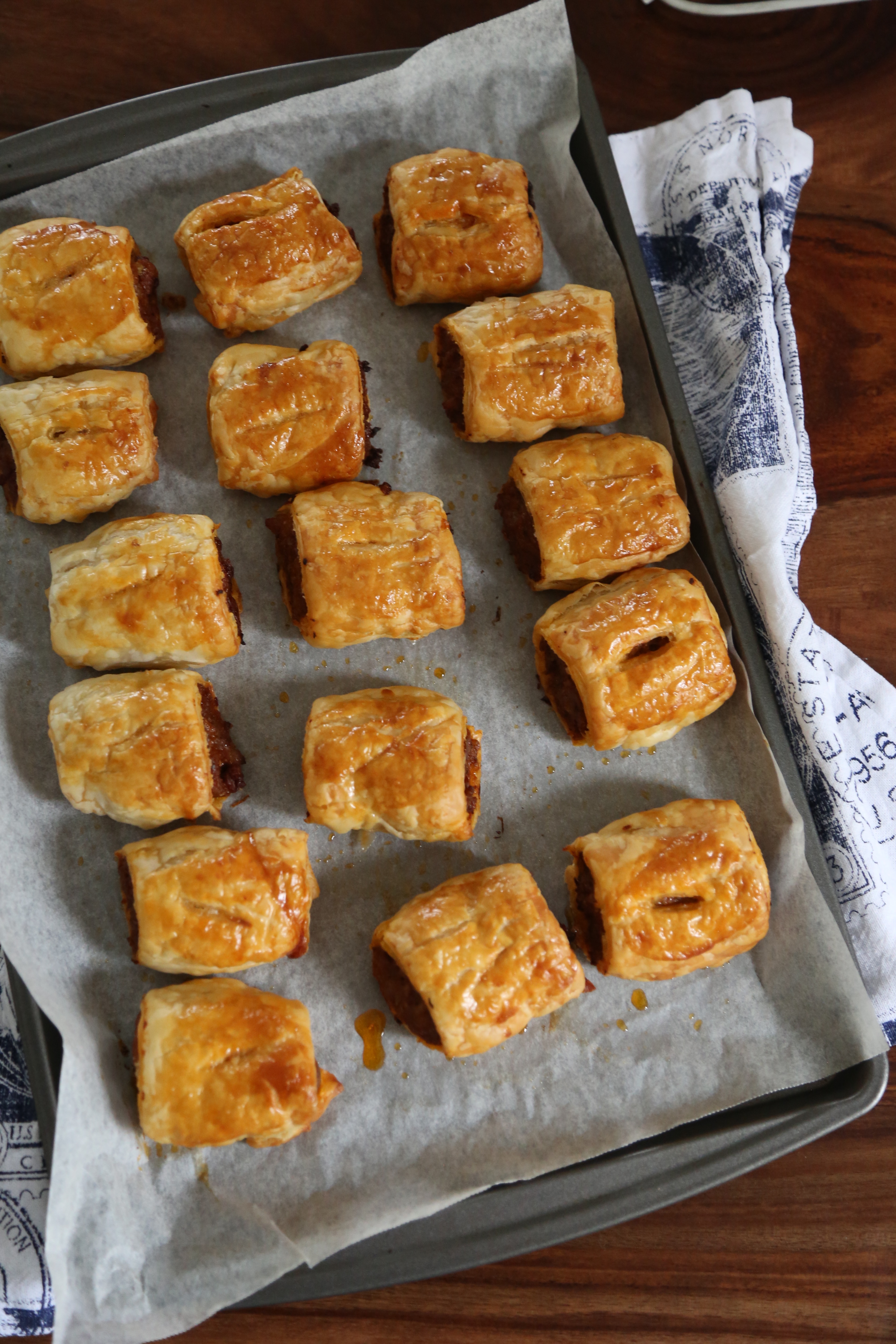 5. Place eat portion on one long-side of each pastry sheet and form into a sausage shape. Brush the long side with a little egg and roll up to enclose.