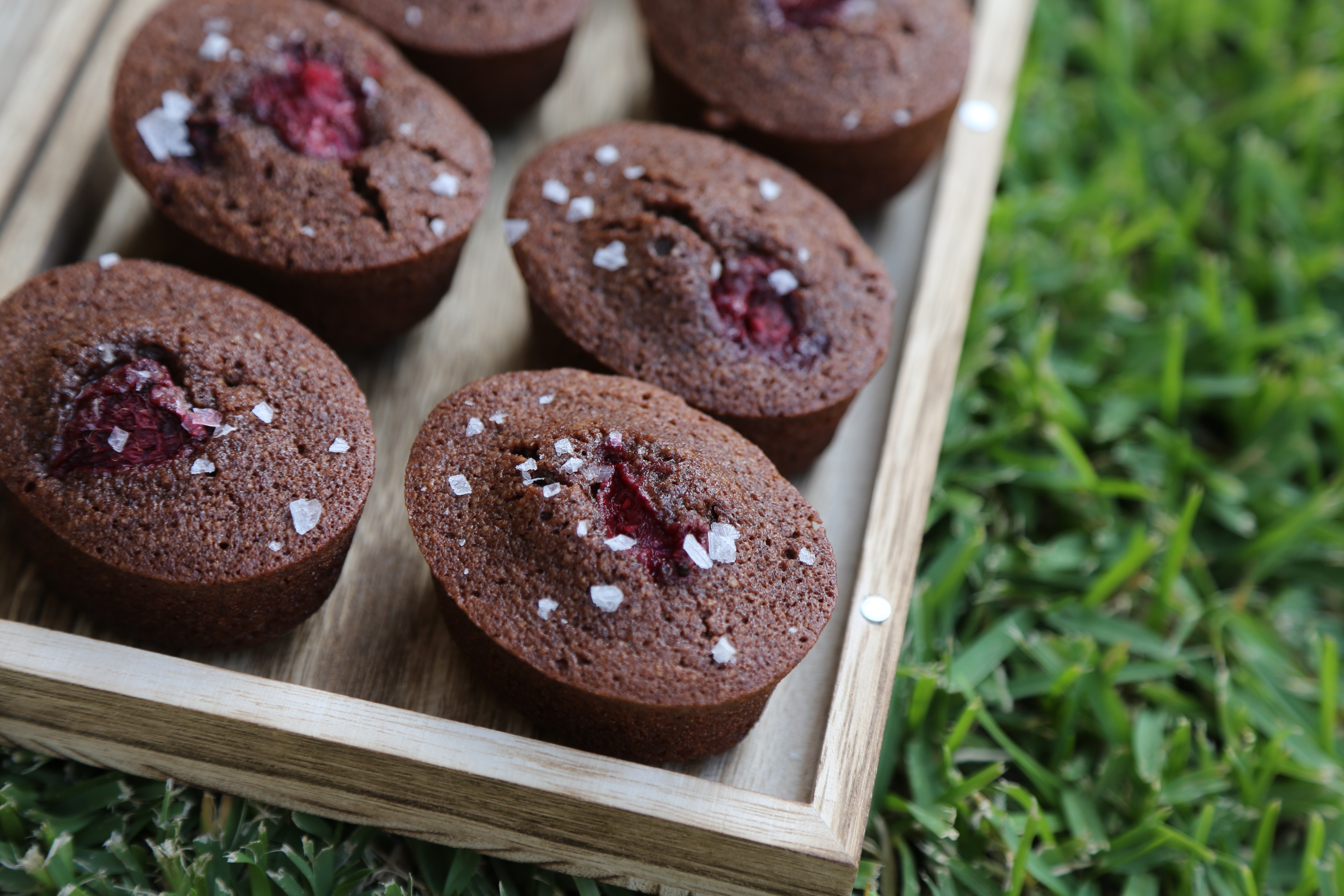 Spoon the mixture into 12 x 1/2-cup capacity lightly greased oval-shaped friand tins, insert a raspberry on top and sprinkle with salt.