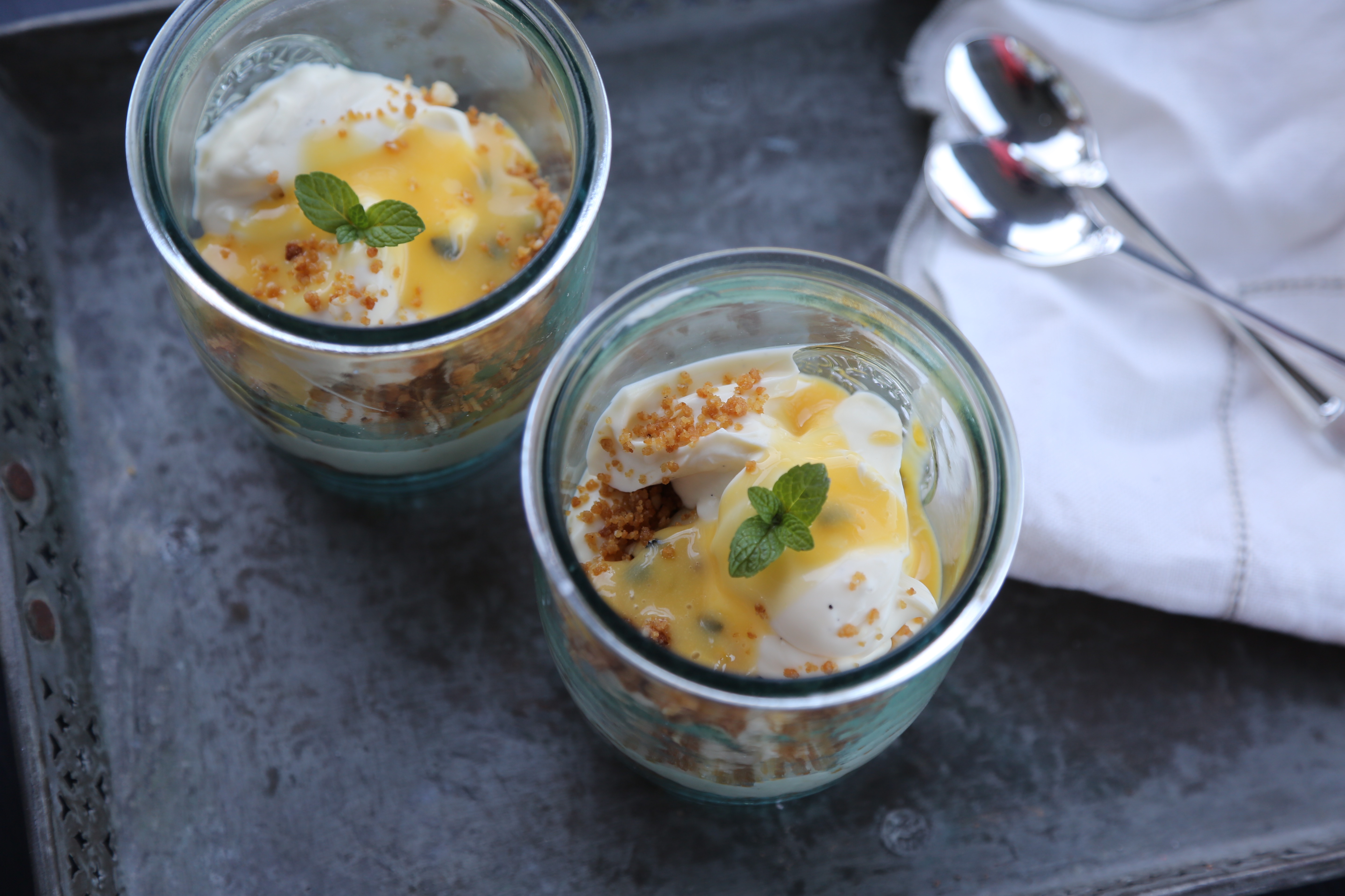 I used drinking glasses to serve these but mason jars, stemless wineglasses will all work. In your glasses, start by placing the biscuit crumb mixture down the bottom. Place some curd on top and then divide the cream cheese mixture evenly between the glasses. Place the remaining the biscuit mixture on top and finish with the remaining passionfruit curd. Chill the finished cheesecakes for a couple of hours before serving.